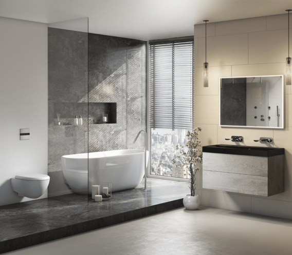 Kies voor grote tegels. De voegen zijn zo minder zichtbaar en het geheel oogt rustiger. Hierdoor krijgt de badkamer een ruimere look.