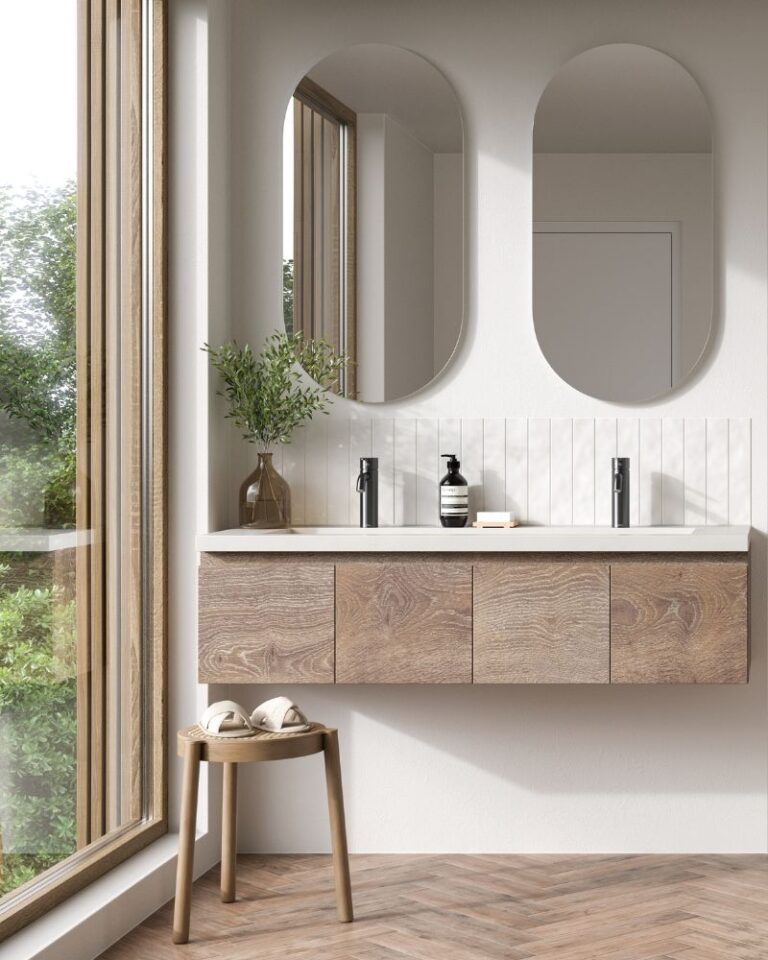 Minimalistische accessoires zijn onmisbaar om een Scandinavische badkamer compleet te maken. Gebruik niet te veel accessoires, zodat de rustige sfeer behouden blijft. Handdoeken en een badmat met structuren passen perfect, omdat ze subtiel contrast toevoegen. Houten wandplanken en kleine keramieken accessoires in pasteltinten brengen een vleugje kleur in de ruimte.