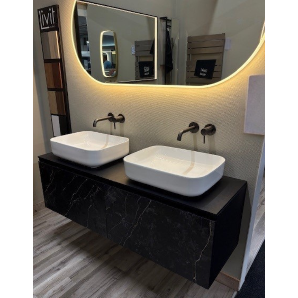Riho Livit meubelset 140x45 cm zwart eiken/marmer incl. 2x keramische waskom wit (exclusief spiegel & kranen). Diepte 45 cm.